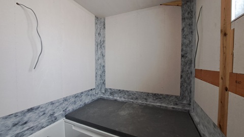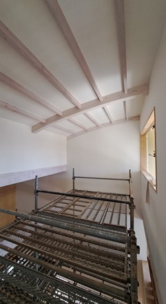 クロス張りが進みます。湾曲した天井のクロスを張る様子ですが、45cm間隔に垂木がありクロス張りの作業も細切れになるので手間が掛かります。普段は1人で作業する職人さんですが、今回は息子さんと2人で進めてくれたので少し早く終えられそうです。