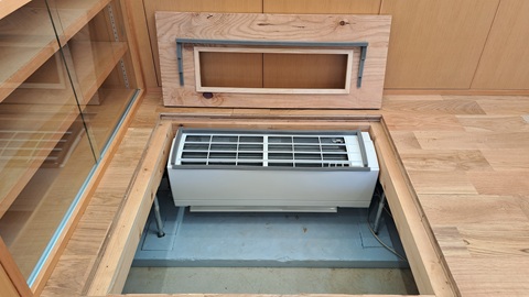 右の写真は設置後の仕上がりです。手前の回転取っ手付いた部分がが点検口の蓋で、奥のガラリが吸込み口です。細かい構造については後日紹介させていただきます。