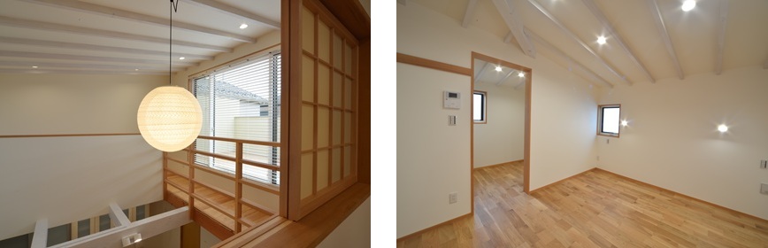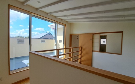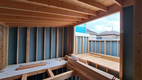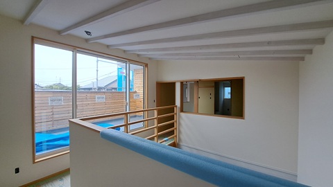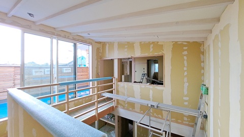 2階寝室から吹き抜け、その先の図書コーナーとベランダを見ています。前回紹介した 『壁内の結露を防ぐための下地』が貼ってあります。内部結露を起こさないか計算して確かめ、防湿フィルムを張らなくても良い仕様にしています。