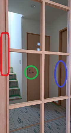 赤丸は付け框で無垢の木を彫りこんだ取っ手です。緑丸は開きドアでアルミ製のレバーハンドルを採用。青丸は支給して頂いた無垢の木を棒状に加工して取り付けた取っ手です。使い勝手、扉の種類によって取っ手の形状を変えました。