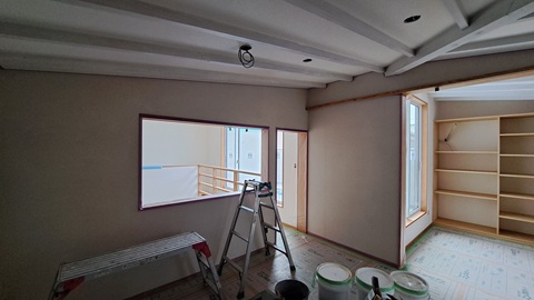 外壁の吹き付け工事が完了し、樋とベランダの笠木が付けば足場の解体が出来る状況です。内装も進み寝室の漆喰塗、階段や図書コーナーの床板の塗装、建具の経師(紙貼り)も完了しました。早く足場が外れるといいな・・・とワクワクが高まります!