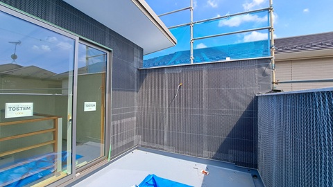 お向かいの窓と干渉しないよう、ベランダの腰壁を少し高くしているので1日中ブラインドを上げておくことが可能です。この窓は冬は10時ころから陽が入るよう設計しています。