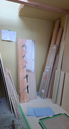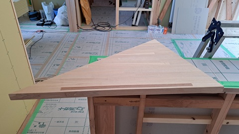 階段の段板です。階段の加工は便利になりプレカット工場で加工できるようになりましたが、段板に施主支給の材料(12/27紹介)をノンスリップとして埋め込んだり、角の納め方など細かいお願いに対応するには大工さんによる加工が適しています。