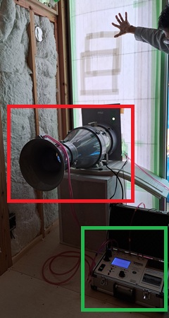 気密測定は赤枠で囲った送風機と緑枠で囲った測定器にて行います。結果は0.38でした。目標の0.58(高気密住宅の基準値)を達成し安堵しました。