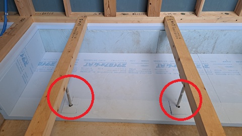 鋼製束(金属の細い柱)の台座が10cm角あり、断熱材を切り抜いて置いたあと細い支柱に合わせて穴あけ加工してに貼りなおしています(赤丸部分)。丁寧な仕事でありがたいです。