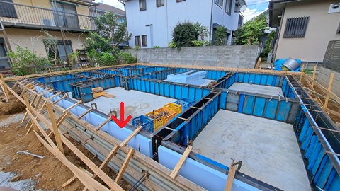 赤矢印がコンクリートを打ち込む前の断熱材です。コンクリートの浮力に負けないよう上をしっかり押さえています。上棟し、屋根や窓が付いて雨が吹き込まなくなった時点で床の合板を貼りますが、その直前に基礎の床面にも断熱材を貼っていきます。機会があればまた紹介いたします。