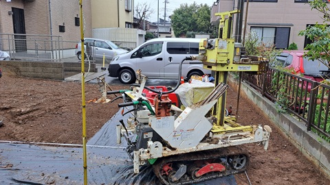 雨の中で地盤調査をしました。結果問題なく設計通り『べた基礎』で工事を進められることになりました。地鎮祭も地盤調査も雨でしたが、連休頃予定している上棟は雨でないことを祈ります。いずれにせよ杭を打つことによる費用の追加はなく良かったです。