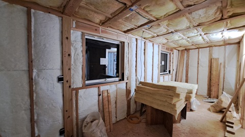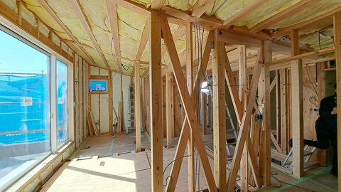 室内側は断熱まで完了しています。外壁の下地工事を先行させているため湾曲した天井のボードは来週以降になりますが、何となく雰囲気は伝わるのでは?細かい部分では窓の額縁(ツガ材)が付いていたり、電気の配線がされていたり・・・