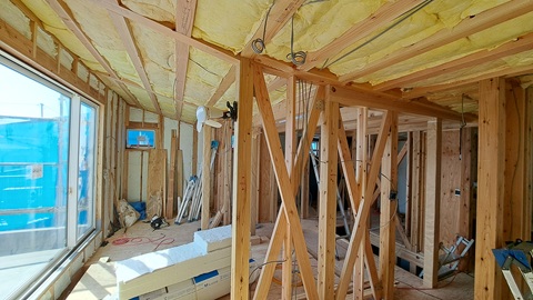 ベランダの防水が終わってからでないと設置出来ない窓以外は設置完了しました。耐震壁の筋交いやボード、耐震金物もほぼ設置完了。