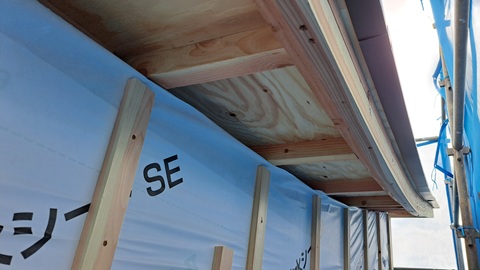 南側ベランダの防水が完了しました。これで雨の心配はなくなりました。軒は短い部分で60cm、深い部分で135cmとなっています。近頃の台風はかなり強力ですが、それでも屋根が吹き飛ばされないよう方杖が3本ついています。今は仮留め状態ですが、ごっつくて長いビス数本で留める予定です。
