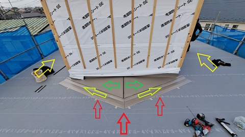 屋根の上流から水が流れてきて壁にぶつかります。壁際に雨水が滞留しないように小さな山をつくってあげます(雪割り屋根とも言います)。あまり急だと板金の加工が難しくなり、難しいほど後で問題が生じます。