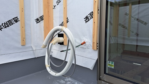 2階洋室エアコンの冷媒管は外壁に出してしまうと道路側からの見た目が悪くなるので、屋上まで壁や天井裏に隠して配管します。