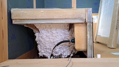 以前はハーフユニットバスの浴槽には断熱材を吹き付けていましたが、今は建物がかなり高断熱化し浴槽のまわりは何もしなくても20度以上は確保できるとして浴槽の断熱は省略していましたが・・・今回は以前の豊田の標準仕様だとして監督さんが断熱の手配をしてくれていました。
