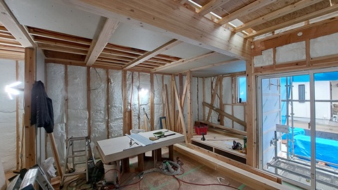 断熱工事がほぼ完了しました。壁は高性能グラスウール・密度36kg・厚さ105mmです。屋根は押出法ポリスチレンフーム(高性能な発泡スチロールのようなもの)+高性能グラスウール・密度24kg・・・結果は断熱等級6になっています。北海道でも通用するレベルです。もちろんもっと高性能な住宅がありますが、これが当事務所の標準仕様です。