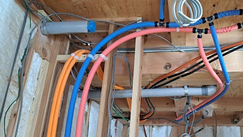 2階床の梁にお風呂の配水管、給水・湯管、電気配線、インターネット用のCD管をピッタリ押し当てて、場所によっては構造の規定内で梁に穴を開けたりと工夫して電気配線を終え・・・