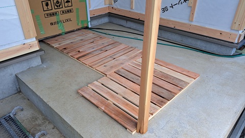 玄関前にすのこが置いてありました。現場内が雨の日でも汚れないよう配慮したものです。外壁下地の杉板を再利用した優れものです。