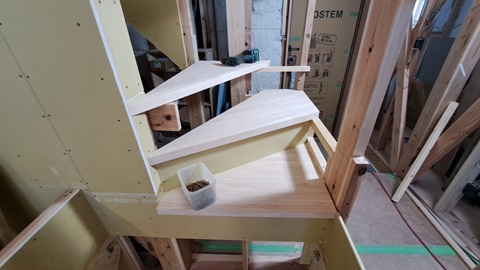 階段を造り始めました。ササラという段板を付けるための斜めの板を使わず、見た目にすっきりした納まりにするため下地工事は複雑になります。家具や格子手すりもからむので時間がかかりそうです。