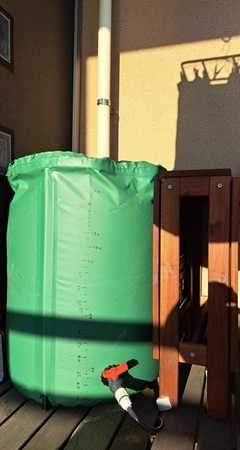 ところがこのタンク、2つのバルブ両方から水が漏れてきます・・・下のバルブは散水用のホースをつなげて凌いでおり、上のバルブは取り外して屋根用の防水テープを貼りました。某国製でア○ゾンのレビューを見たら『部品が足りない バルブから水が漏れる』など評判が悪いことが判明。蓋の縫い目がほつれて外れた人もいるので、小生は使えているのでまだ良い方かと・・・。