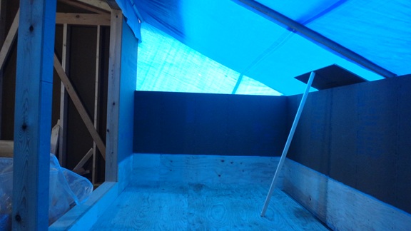 今回も上棟翌日に雨が降り、ベランダの防水下地完了後にも雨が降りました。写真は防水前のベランダに雨が吹き込まないよう、シートを被せた様子です。ありがたいです。かなり効果があり、ベランダは濡れていませんでしたが・・・窓の開口やちょっとした隙間から雨は吹き込んでいました。