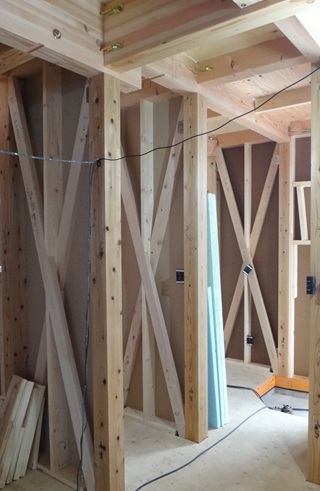 写真は1階玄関の方を見ています。ダブルの筋交いが入った壁が3列並んでいて、そのうちの2箇所は7倍の強度を持つ強力な耐震壁になっています。
