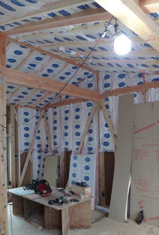 窓が付き雨の心配が無くなり、構造検査が終わり筋交いが見えなくなっても良くなったので、断熱材を詰め始めました。天井裏に敷並べる方法では隙間が多く断熱の効きが悪いので、当事務所では屋根垂木(屋根板を支える部材で45cm間隔に入っています)の間に詰め込んでいます。もちろん、落ちないようにしっかり留めつけます。壁の断熱材を間柱の間に詰め込むのと全く同じです。