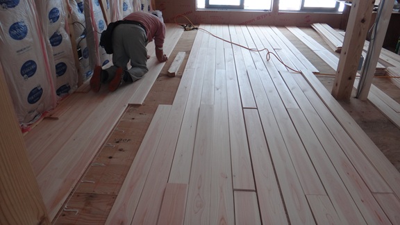 内装工事のトップはフローリング張りです。樹種によって張り方が違います。1・2階のナラ材は、夏の湿気で伸びてフローリング間の隙間がキツくなりすぎることを避けるために少し隙間を空けながら張ります。3階の檜は乾燥収縮による隙間が大きくなりすぎることを避けるために隙間なく張っていきます。