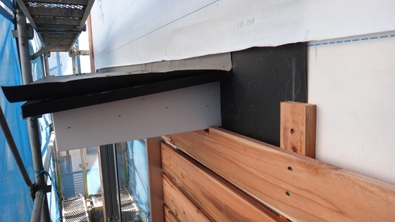 写真は庇の取り合い部分です。透湿防水シートと庇の破風板の間に黒い防水シートが挟んであります。リフォームで外壁を剥がすと、この部分の柱が腐っていることがあります。水が入っても下地まで劣化させないよう配慮しています。もちろん左官の下塗りの段階でシーリングによる止水も行います。見えないところも丁寧に!