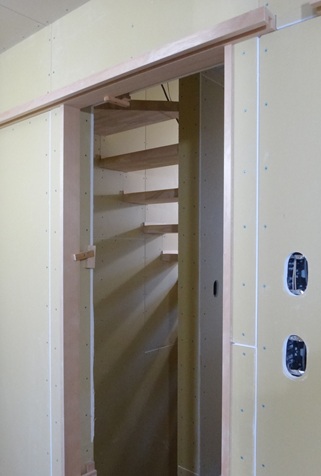 階段や引戸の鴨居など造作工事が進みました。階段の段板は防火規定で60㎜と厚手の集成材で、鴨居は無垢のツガです。扉はツガとの相性の良いベイマツで、現在建具屋さんの作業場にて作成中です。
