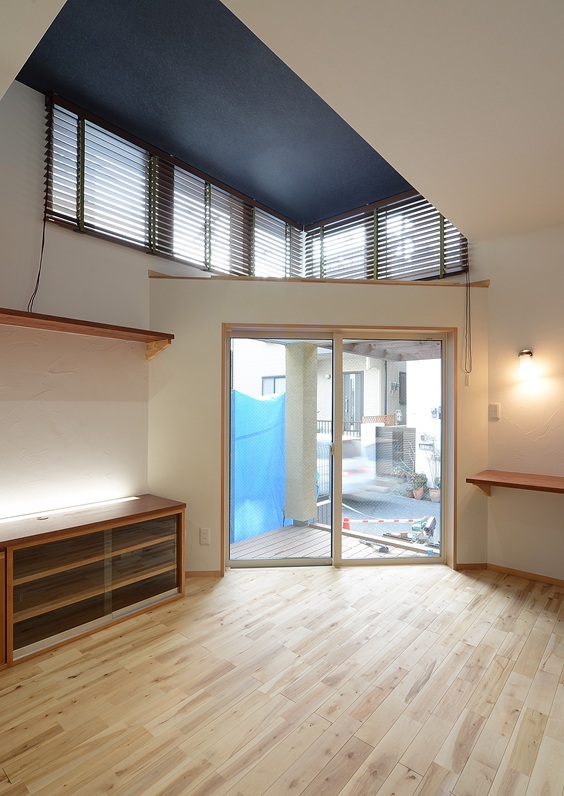 木造ならではの自由な空間設計により日差しを採り込む高窓とウッドデッキをコンパクトに納めました。