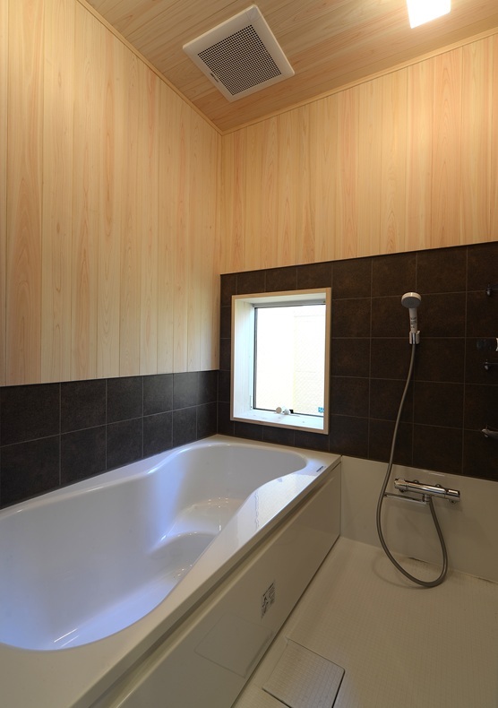下地を準防火構造にすることでヒノキ板張の浴室にすることができました。いい匂いです。窓からはベランダ庭園が楽しめます。