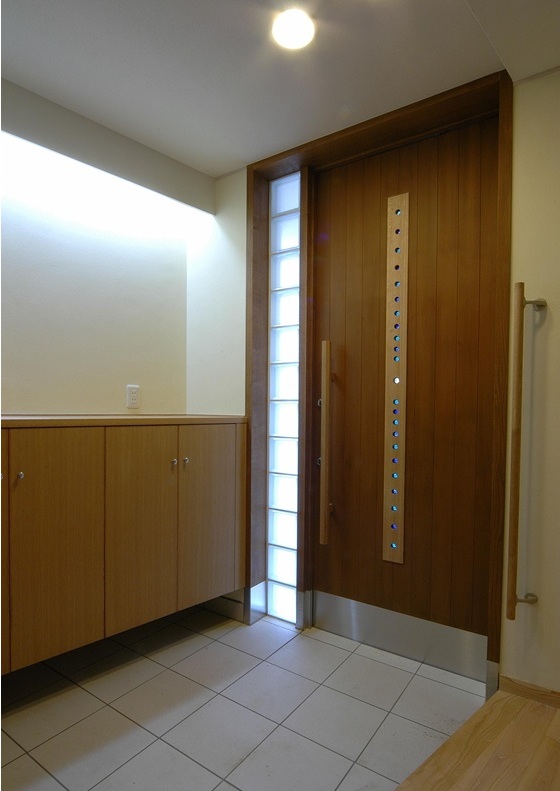 敷地境界線から一定の距離にあるドアや窓は木製とすることができます。ガラスブロック窓とビー玉をはめ込んだ玄関扉を組み合わせた例です。