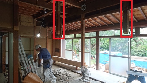 欄間も取り外し、梁と柱だけになっています。赤枠で囲んだ短い柱は、障子の上枠(鴨居)を吊っていた短い柱です。これから撤去し、土台から梁までを1本の長い柱に入れ替えます。