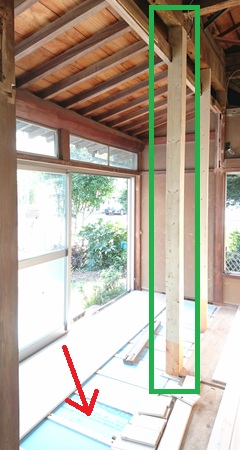 2.では梁から短い柱がぶら下がっていましたが、その後撤去し緑枠で囲んだ長い12cm角(4寸角)の柱を入れました。3.6mあった障子の開口部が、1.8mの開口部と耐震壁に変わります。