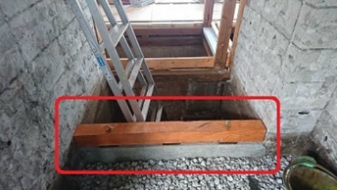 浴室周りを解体。思ったよりも傷みはありませんでした。新たな出入口の下に基礎をつくり(赤枠)土台を設置しました。一部シロアリに食われていた部分がありましたが、ひどい所や不要な部分は撤去し防蟻剤を塗布しました。