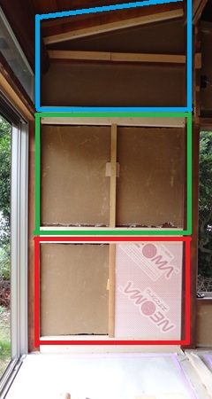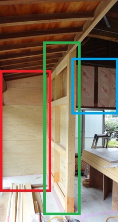 柱の間隔が91cm以上の場合は合板を横に使います。柱の間に合板の幅と同じ91cm間隔に角材を取り付けます。そこに断熱材をはめ込んで、赤枠・緑枠・青枠の形で合板を釘で固定します。