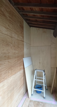 下地を入れて断熱材を挟み、合板を張るという工程がひと目で分かる写真を撮ってきました。