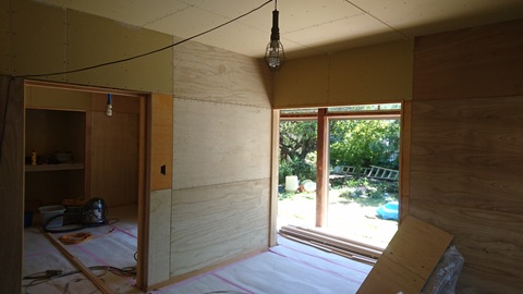 耐震壁となる部分には構造用の合板が張られています。その手前、耐震壁以外の部分は安く柔らかい(加工しやすい)石膏ボードを使用しています。