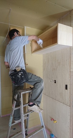 塗装中の物は一見ただの箱ですが、吊戸棚です。丈夫で物が2段に置けるのがメリットです。