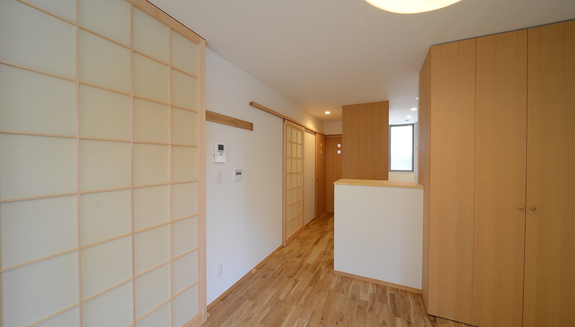 住宅密集地ですが、1階の居間でも陽のあたる住まいになるよう近隣住宅の配置・高さなどを調査し、日照検討を重ねました。結果、隣家の隙間から朝日と午後の陽が差し込む住まいとなりました。