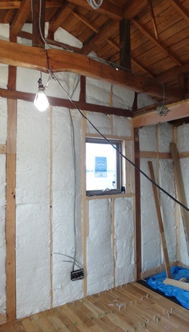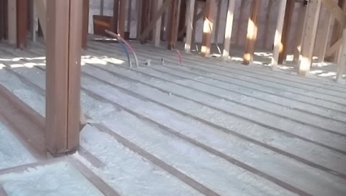 今回は床を支える根太という部材の高さを10cm程度にしてそこに現場発泡の断熱材を吹きました。隙間なく、しかもほぼ均一な厚さも確保できます。