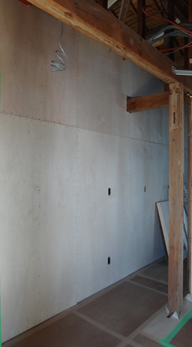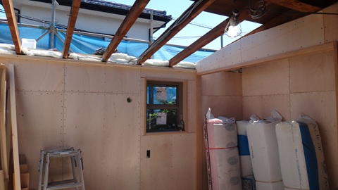 断熱工事が完了し、耐震壁の合板を張っていきます。耐震改修用の工法です。