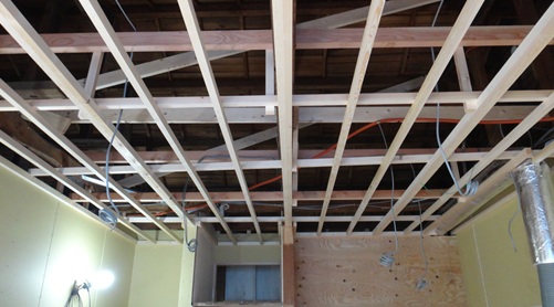 天井下地工事が完了しました。耐震壁となる部分には合板、それ以外の壁には石膏ボードが張っている様子が分かります。今回天井の断熱はセルロース吹き込みを予定しています。右端に写っているのはキッチンの換気扇ダクトです。照明機器の配線もいくつか垂れ下がっています。