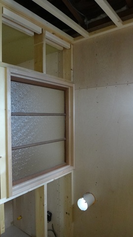 トイレどうしを仕切る壁には解体前の窓をそのままはめ込むことになりました。アジがあります・・・。