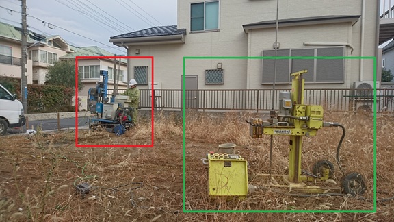 写真奥(赤□)はスウェーデン式サウンディング調査機で、手前(緑□)はSDS調査機(土質推定試験)となります。調査目的が違うので機械も動き方も違い、興味深く見守ってきました。