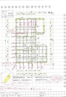 しかし今日の住宅ではコスト・スピードが重視され、ほとんどがプレカット工場にて加工されています。これは2階の床梁と柱に関するプレカット図で、赤やピンクが指示・お願いについてのメモです。間違えはほとんどありませんが、構造図や意匠図だけでは伝えられない設計者でないと気がつかない細かい修正を加えてもらう必要があります。