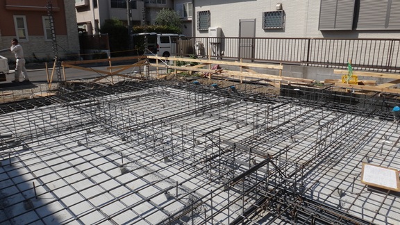 基礎工事完了。飛び出している2階部分を支えるためのコンクリート製の柱が見えています。ただし、まだボイドという型枠代わりの紙菅が剥がされていません。綺麗な渦巻き模様が出るはずなので楽しみです。