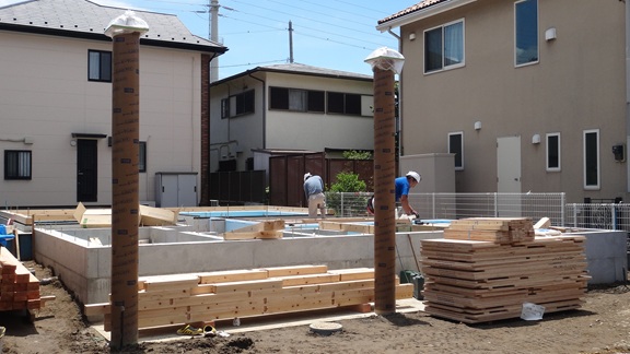 この規模の建物で土台敷きは2日間。足場建てに1日。上棟はクレーン車が来れば1日といった感じです。3日後、上棟を予定しています。