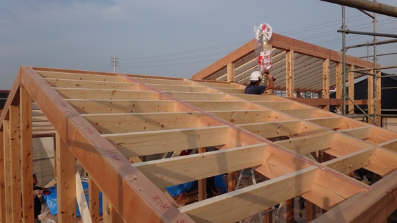 上棟しました。全景は別の機会に!暑さ、寒さ対策で屋根断熱を二重にする計画です。垂木(写真に写っている細い部材)はツーバイエイトの材料を使いました。幅38mm、高さ184mmの材料なので103mmの厚さの断熱材を2枚重ねで入れられます。材料代も加工済の輸入材なので、安く効率的です。