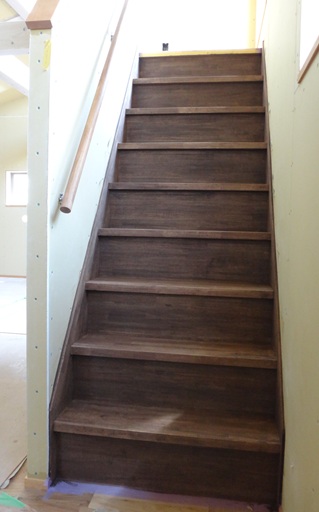 当方では自然素材系のオイル(松油)を塗るようにしています。建て主さんが自分で塗ることも出来るのでメンテナンス性が良いと言えます。クリアー塗を多用しますが、梁や垂木は白を2度塗ることになっています。しっかり色を付けたいので拭き取りません。階段は茶系で、拭き取りながら2度塗る方針です。