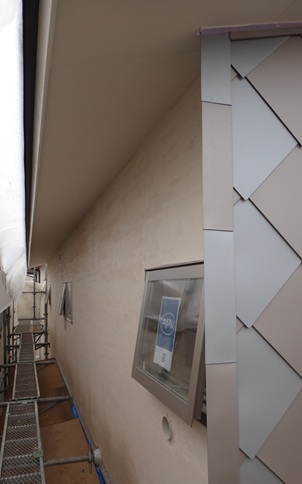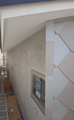 写真の左側は左官仕上げの下塗りです。通気層を設け、杉板を張り(大工工事・17参照)ルーフィングと網を張り付けた後に下地モルタルを塗っています。雨水はしみ込むものでどうしても防げません。庇によって雨の吹き込みを軽減しつつ、通気層によりしみ込んだ湿気を逃がしています。